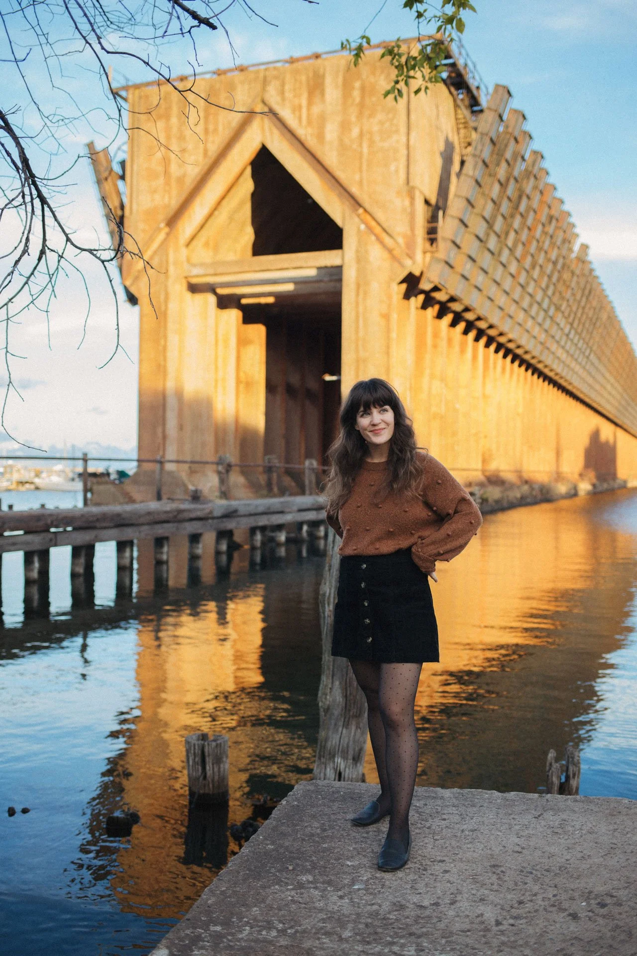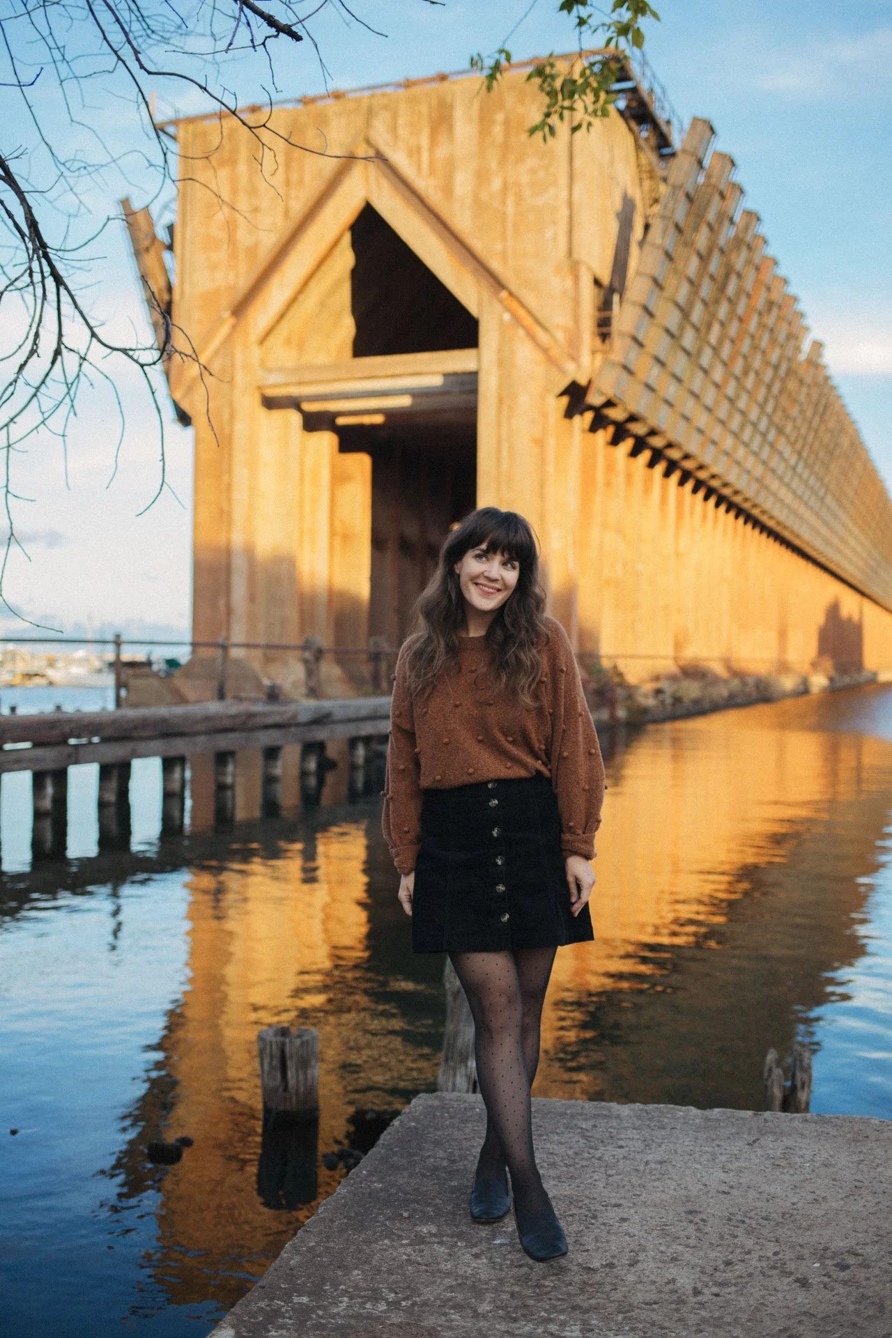 This is one of my favorite little perches by the Lower Harbor Ore Dock in Marquette to take outfit photos. It’s been a minute since I sat here with my tripod! I definitely plan to get out for some autumn road-trip adventures soon… but it’s nice when I also can just take a walk downtown and find so many spots to take photos as well. This night was pretty perfect… just the cool breeze, the trees starting to shift to autumn colors, the earlier golden hours, I just love this time of year. And it gives you plenty of time to have a little daylight after work to enjoy/get outside, but to have enough time in the evening to cozy up with a glass of wine (Witches Brew for me) and a suspenseful show (currently watching Gypsy on Netflix.)