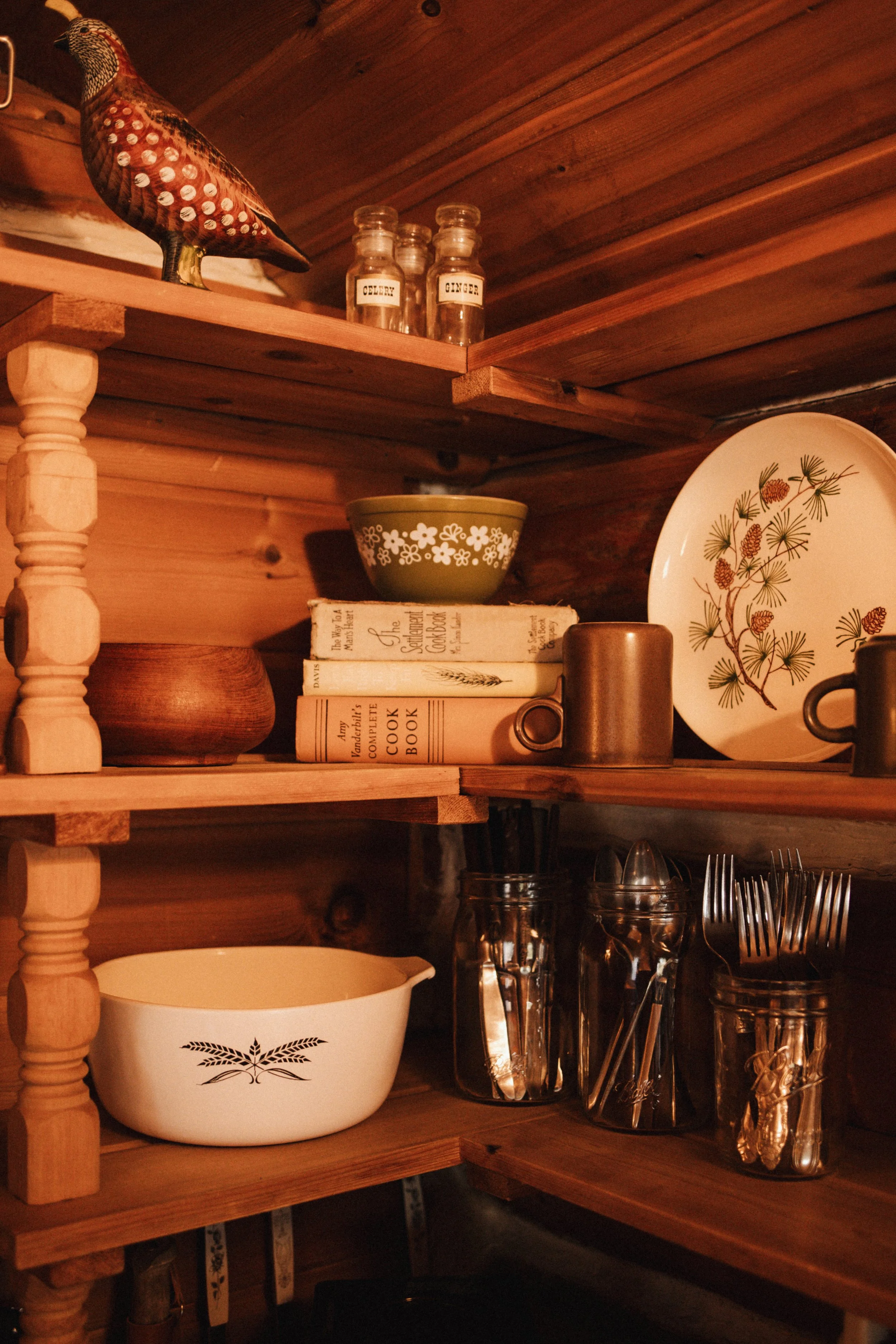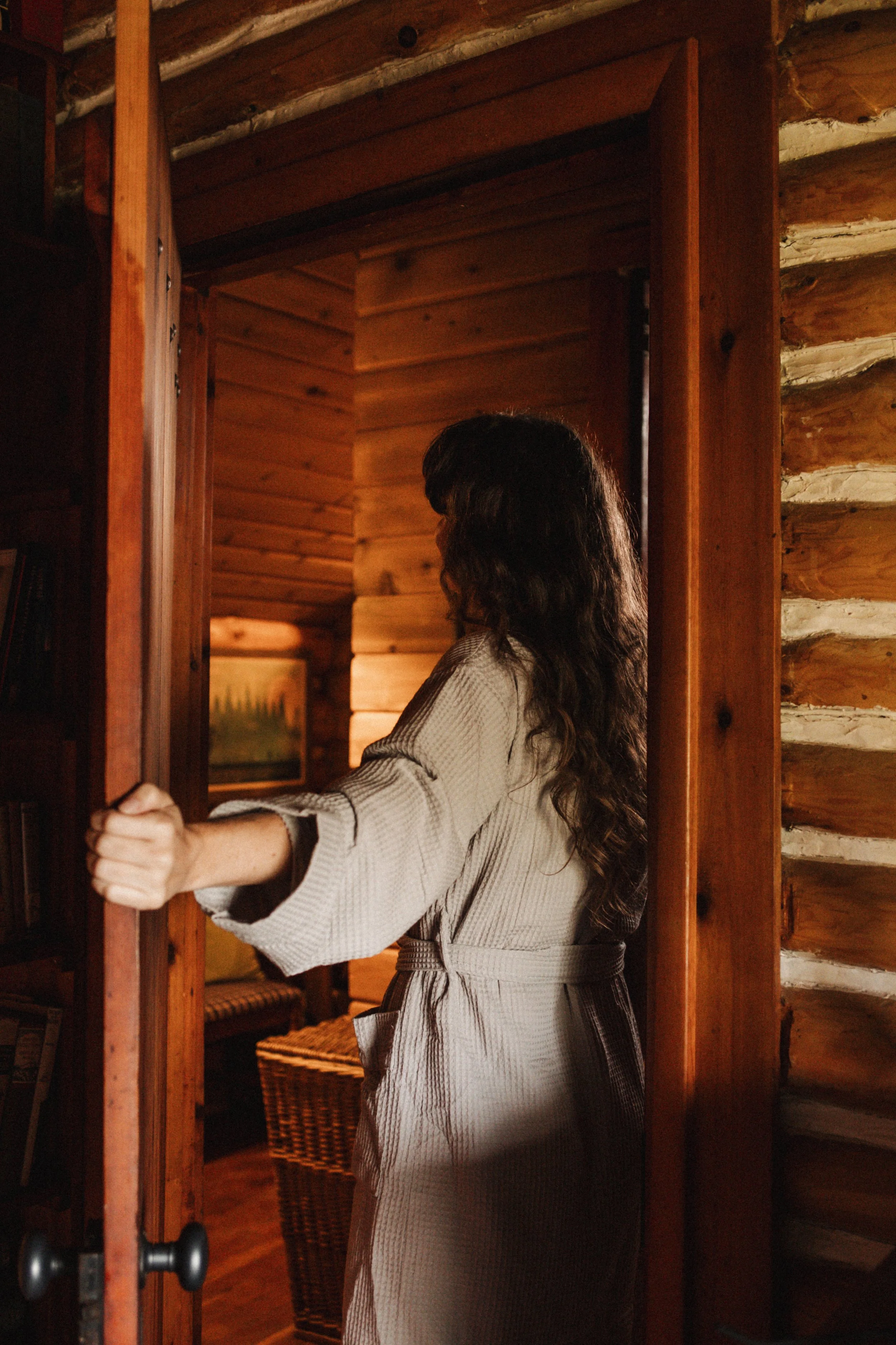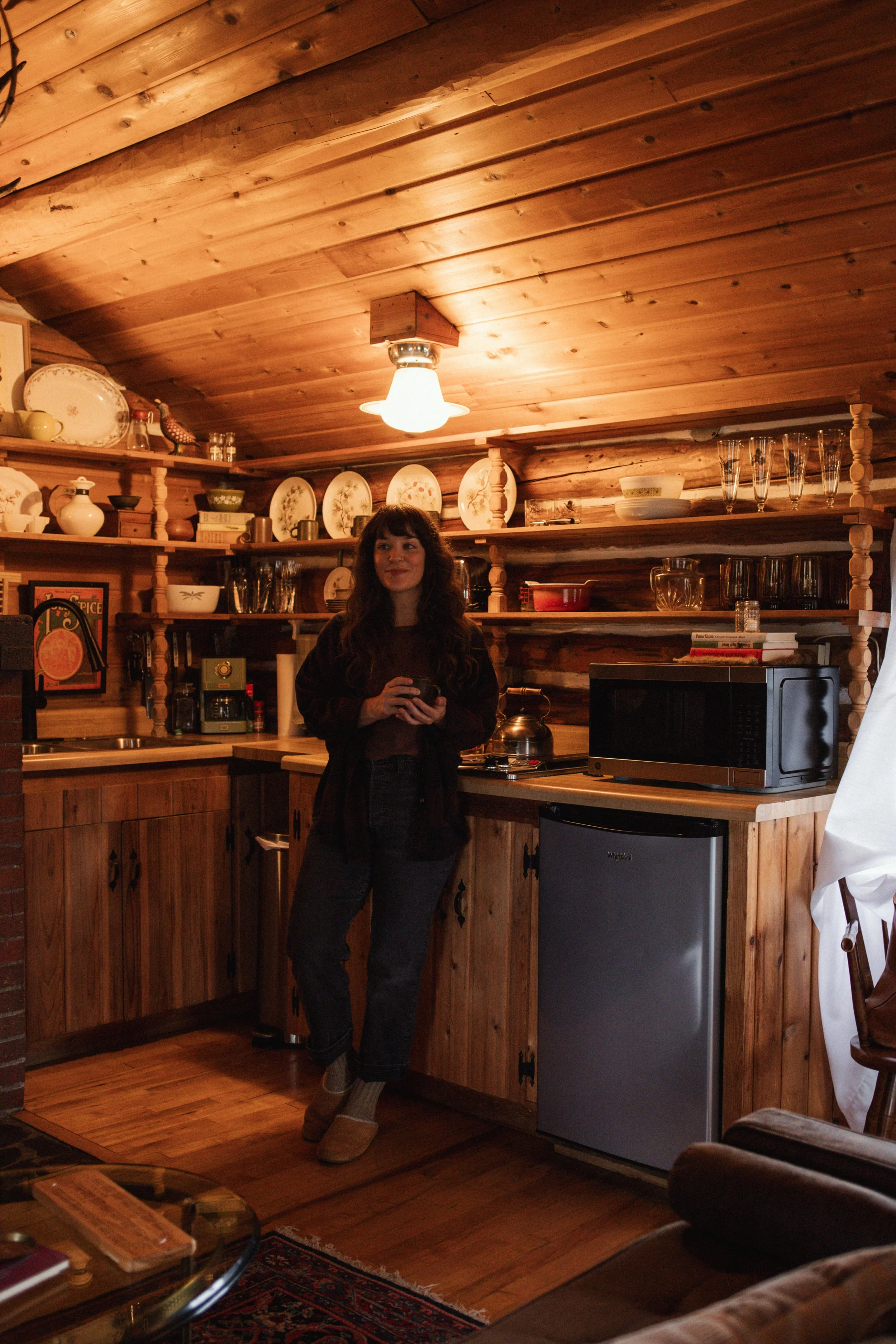 I stayed in The Cedar Cabin, which is a 100-year-old hand hewn log cabin, that’s perched up on a bluff that looks out over Juncob Lake on one side, and the Michigamme River on the other. It’s very accessible with parking and other cabins nearby, and is so wonderfully cozy, and literally straight out of something you’d see on Pinterest. Madeline and Michael, owners of the resort, have the most… beautiful eye for aesthetics, and welcoming vibes… you’ll never want to leave. Especially after you cozy up inside by the wood burning fireplace. It’s magical! This cabin has a living room area with a dining table, a quaint kitchen, bathroom, and stunning bedroom (that gallery wall, though!) and has a back entrance with a little porch to enjoy morning coffee.